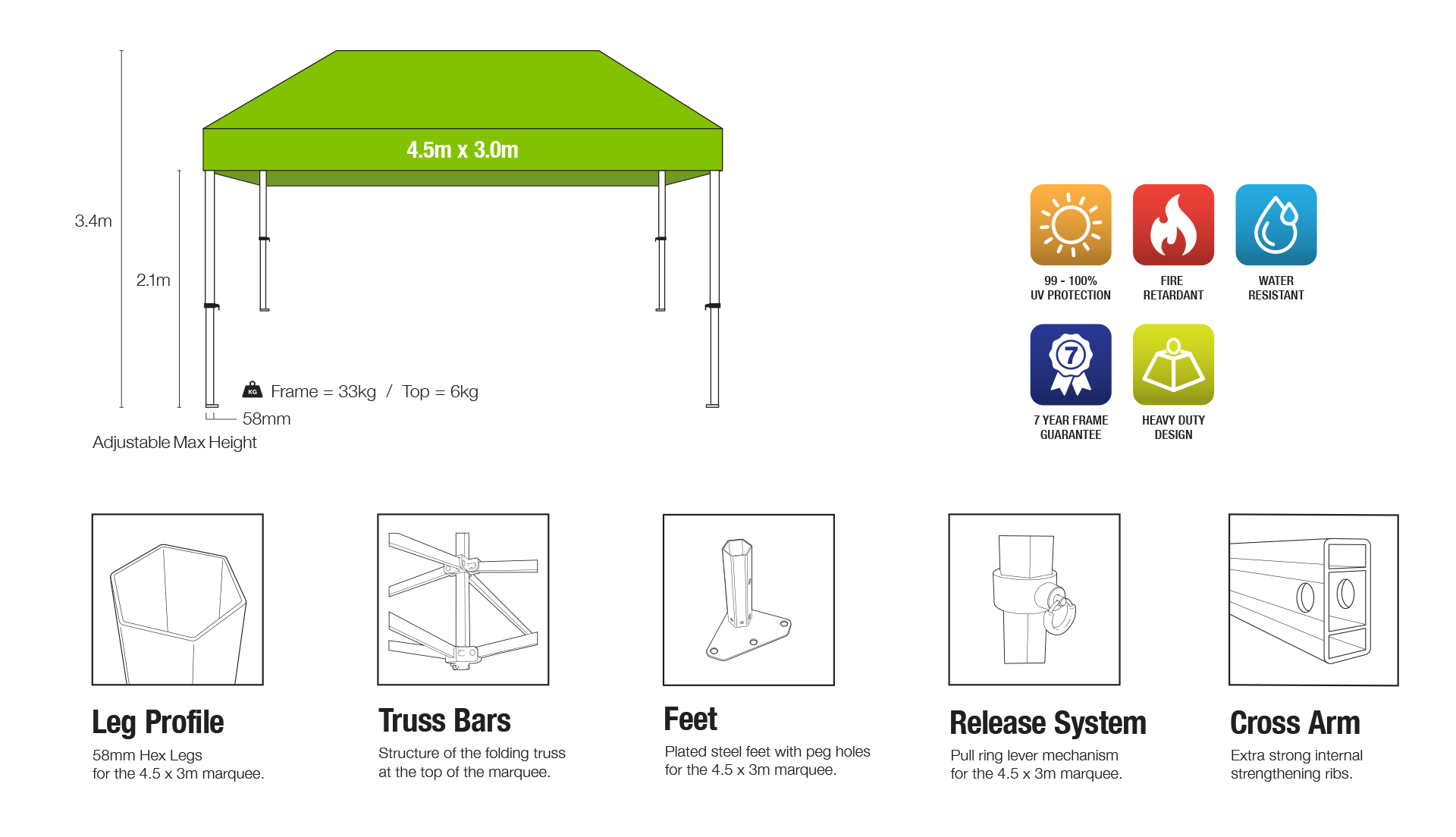 Our 4.5×3 Commercial Heavy Duty Marquee roof is made with commercial grade, thick polyester material making it resistant to water and UV penetration. Expect your marquee to last, with our commercial heavy duty aluminium frame featuring reinforced cross arms for additional strength. Our marquees are built to last, and we provide replacement parts when needed.