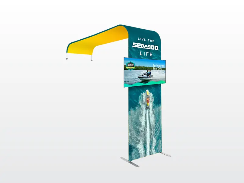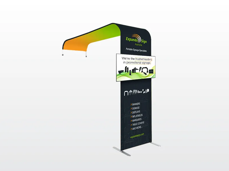 The display features vibrant full colour printed tension fabric graphics that create a clean, seamless presentation. The large format design helps maximise brand visibility, while the integrated TV rack allows you to enhance your display with video, presentations, or digital messaging.