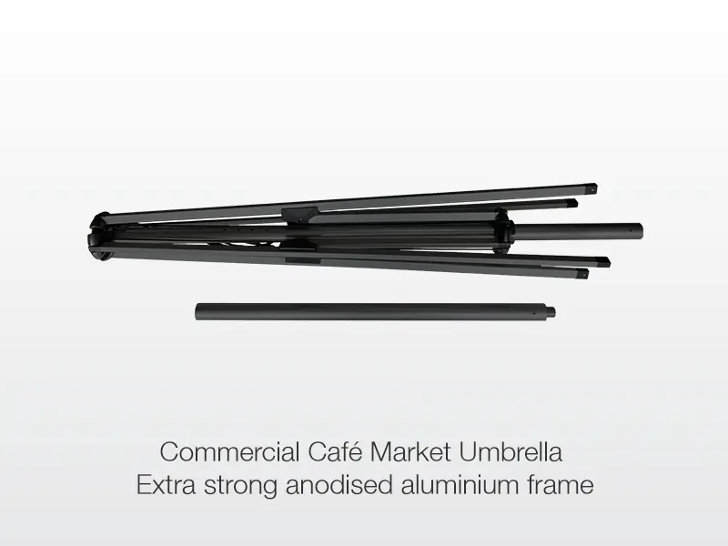 Expect your Commercial Café Market Umbrella to last, with our commercial heavy duty anodised aluminium frame featuring a strong split center pole for easy transport. The roof is made with commercial grade, thick polyester material making it resistant to water and UV penetration and are fire retardant. Our umbrellas are built to last and we provide replacement tops when needed.